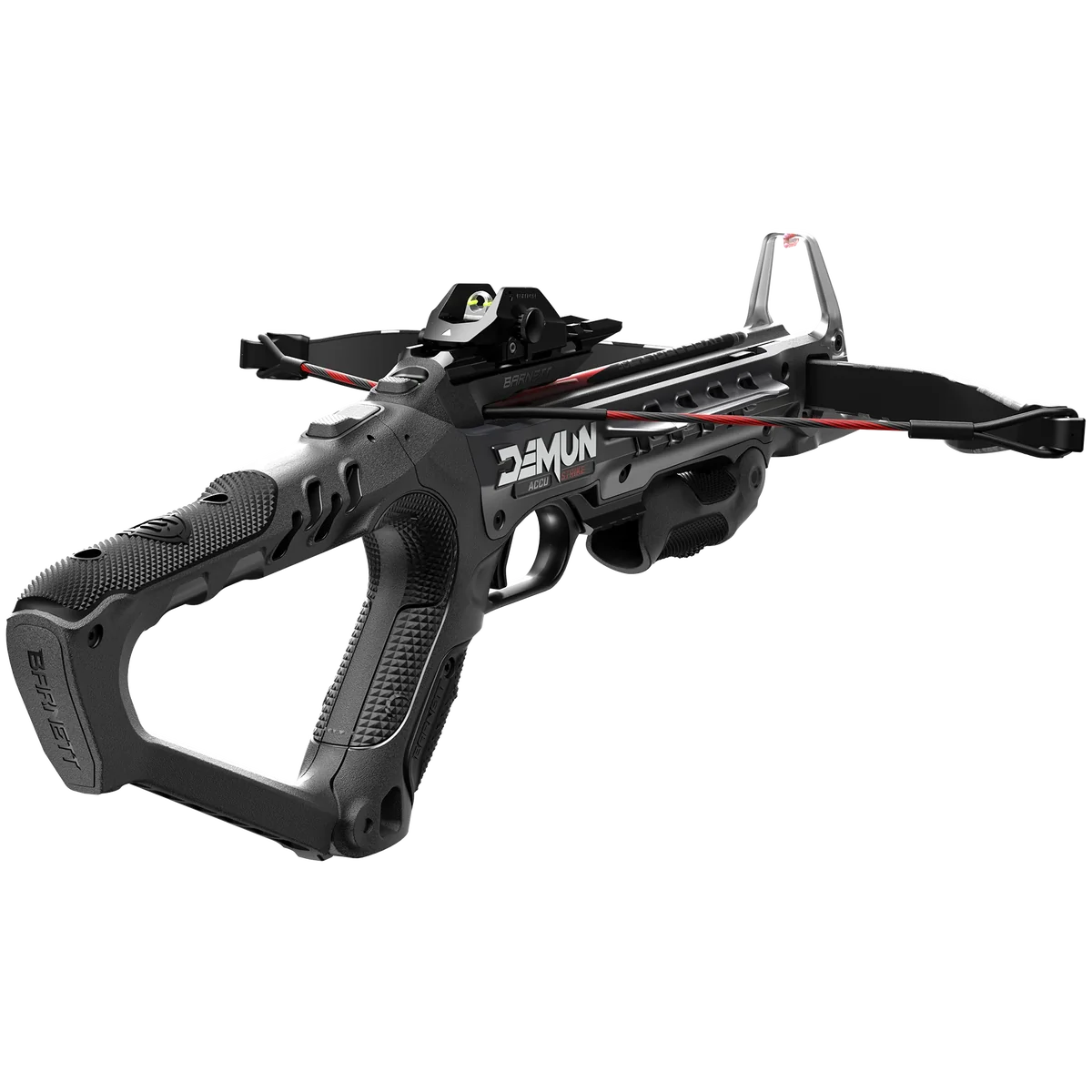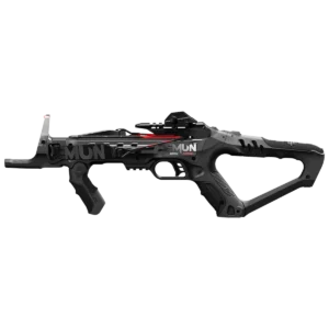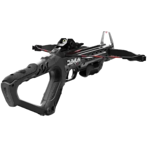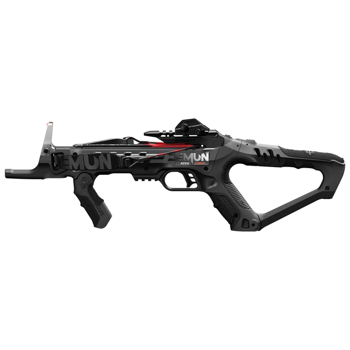The DEMUN AccuStrike Compact is a handheld recurve crossbow that balances power and portability. Its compact pistol-style profile and reinforced parabolic R60 limbs produce reliable, repeatable performance while propelling 7-inch Demun(TM) 3F Hyperbolts at speeds of up to 190 feet per second. A smooth single-stage break-action cocking mechanism simplifies reloads, making the AccuStrike straightforward to operate. Designed with practical aiming and control in mind, the AccuStrike features an adjustable fibre optic pistol sight for precise alignment and a flip-down tactical foregrip to steady your hold. The compact, easily manoeuvrable form factor makes this crossbow well suited to short-range, controlled shooting scenarios where quick handling and accuracy are important.