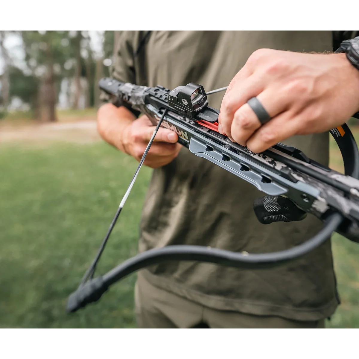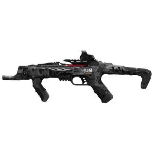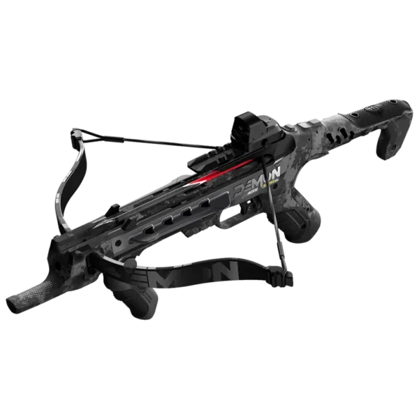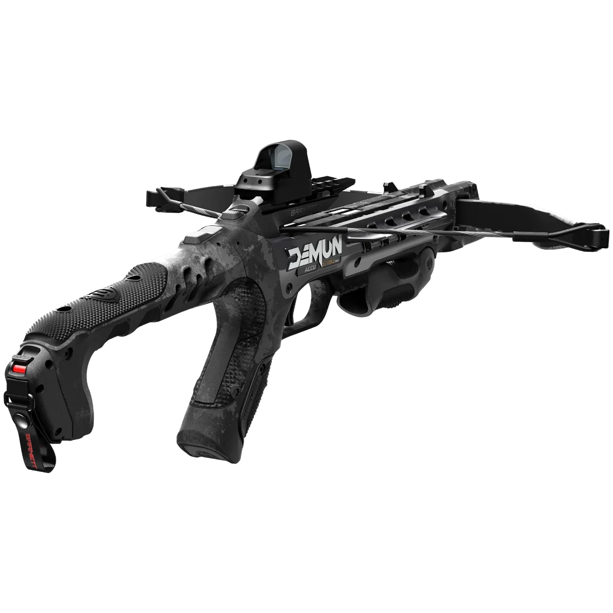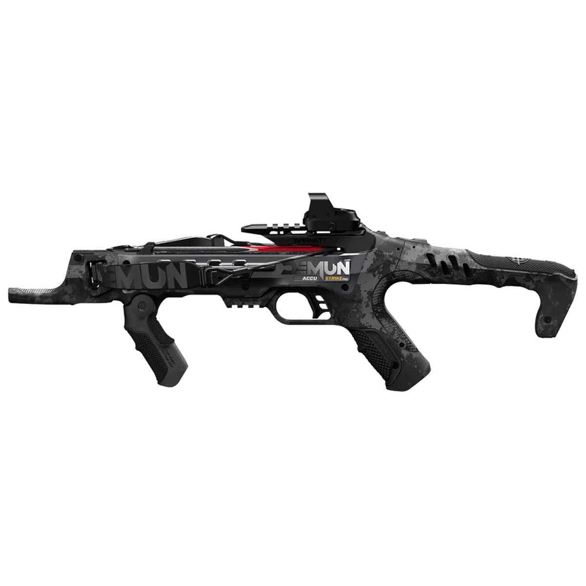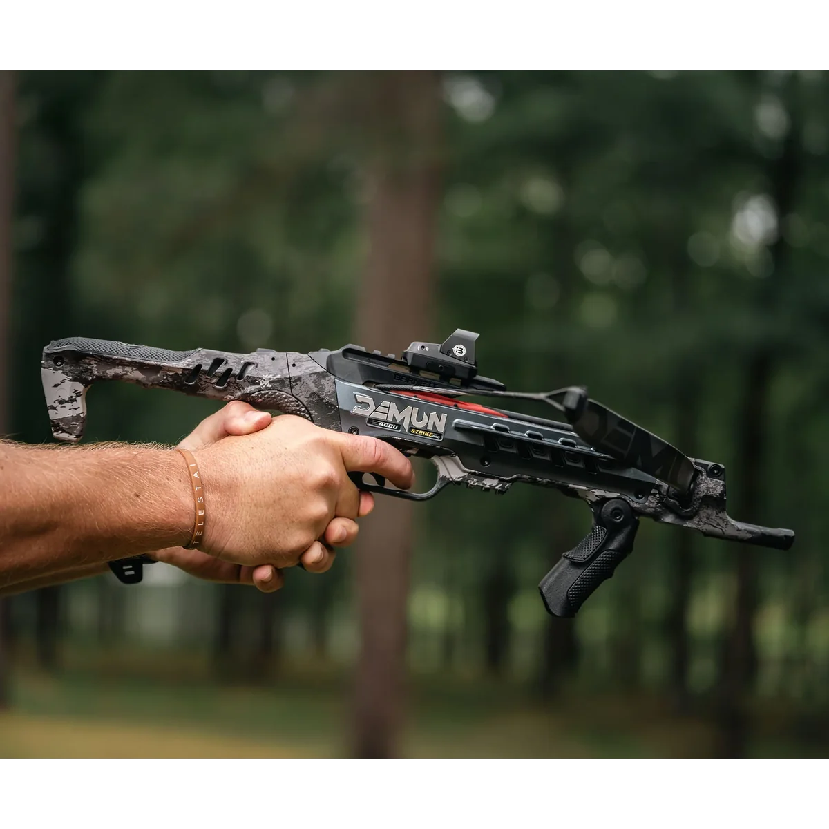 The DEMUN AccuStrike Pro Compact is a handheld recurve crossbow engineered for users who need a compact, easily manoeuvrable platform without sacrificing performance. Its pistol-style layout keeps the overall footprint small while the reinforced parabolic R80 limbs deliver dependable power. A patented two-stage break-action cocking mechanism cuts cocking effort by 50%, making the AccuStrike Pro quicker and less tiring to prepare for each shot. Precision and control are reinforced by an adjustable red/green dot reflex sight and a flip-down tactical foregrip that gives a rock-steady platform at full draw. The AccuStrike Pro launches 7" Demun 3F Hyperbolts at up to 210 ft/s (approx. 64 m/s), offering consistent speed and accuracy for a range of shooting applications. Compact, well-balanced and simple to operate, the AccuStrike Pro is a practical choice for anyone seeking a portable recurve crossbow with solid performance.