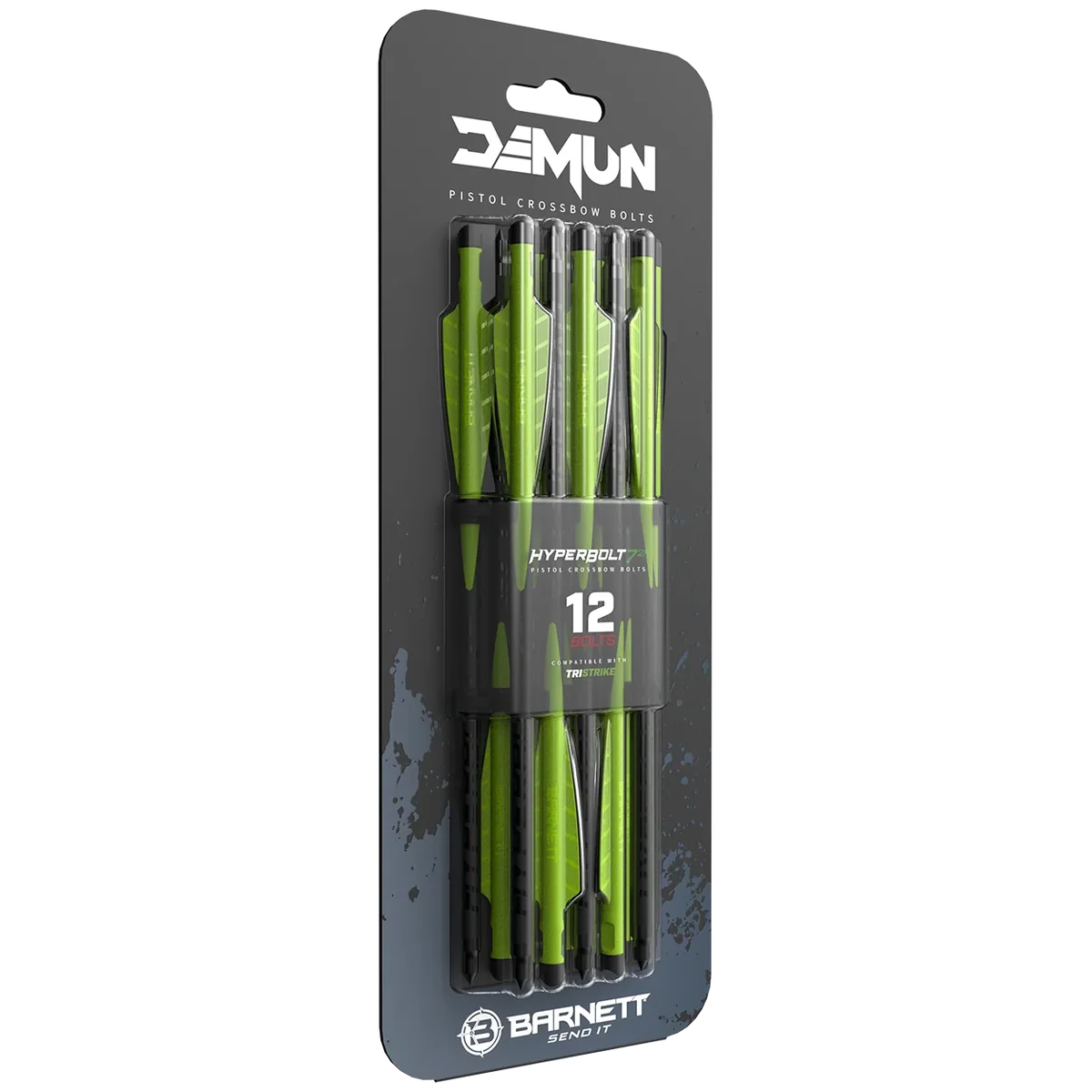 The DEMUN HYPERBOLT 2 FLETCH (12PK) are 7-inch mini crossbow bolts designed specifically for use with the DEMUN TRI-STRIKE and its patented 3-shot 'Rapid Reload' magazine. Each bolt features a low-profile 2-fletch configuration and a compact length that is optimised for feeding from the TRI-STRIKE's magazine and barrel. Supplied as a pack of twelve, these HyperBolts are intended to provide consistent seating and repeatable feeding in the TRI-STRIKE's break-action, three-bolt system. Compatibility: DEMUN TRI-STRIKE (including its patented 3-shot 'Rapid Reload' magazine).