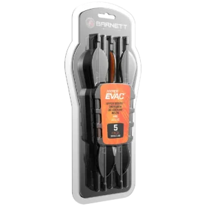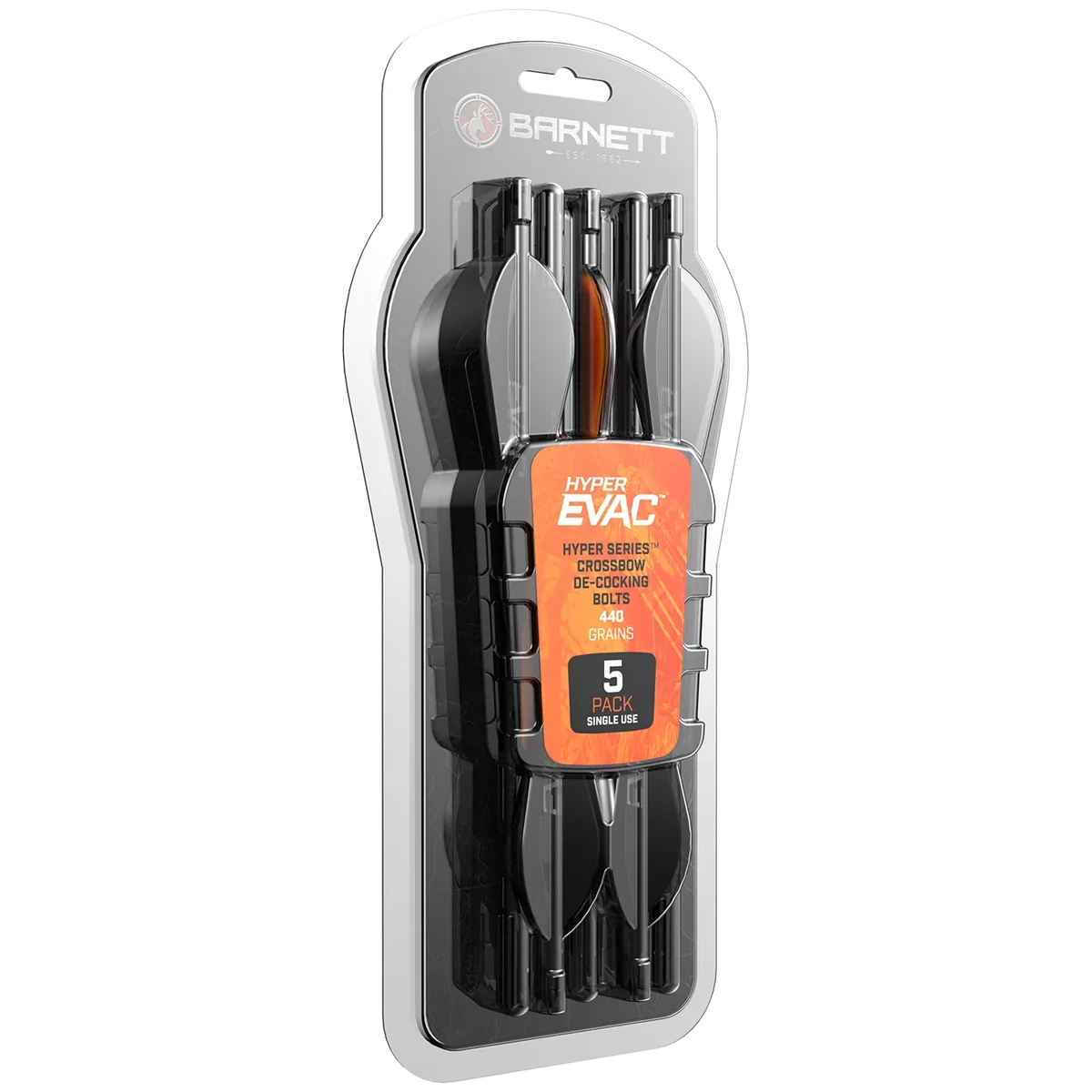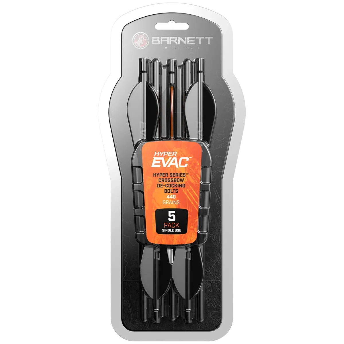The HYPER EVAC De-Cocking Bolt is a purpose-built solution for safely discharging the energy stored in Barnett Hyper series crossbows. Each bolt weighs 440 grains and is single-use, providing a controlled, reliable method to release tension without risking damage to your regular bolts or the crossbow itself. Supplied as a pack of five, these bolts are handy to keep with your kit for field or workshop use. Operation is straightforward: remove any regular bolt, insert the Hyper Evac with the orange fletch facing down, confirm there is a clear, unobstructed area of ground to shoot into, aim at approximately a 45 deg angle to the ground, take the safety off and pull the trigger. The bright orange fletch aids correct orientation and visibility after use. Designed for compatibility with Barnett Hyper series crossbows – follow the crossbow manufacturer's instructions and local safety regulations when using de-cocking bolts.