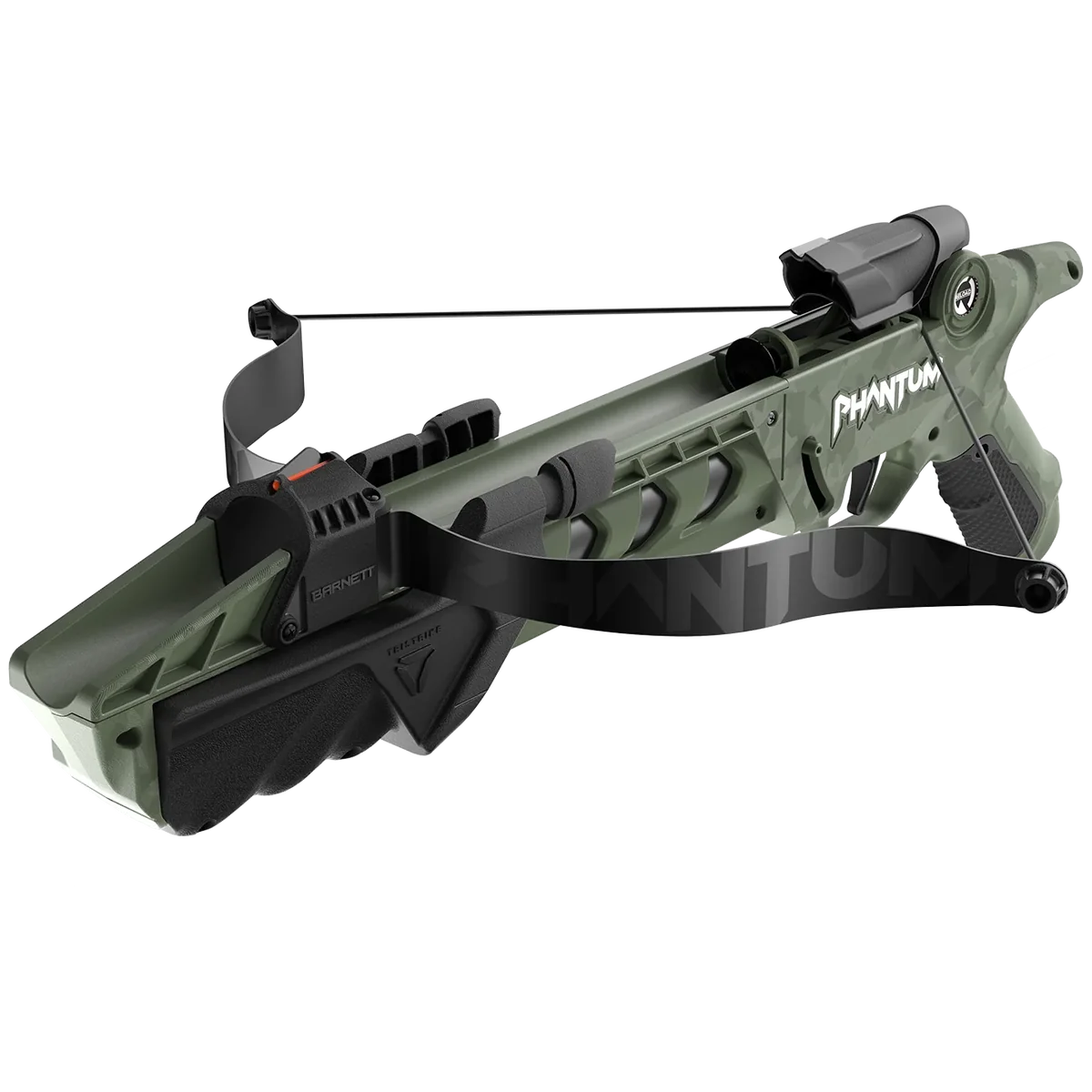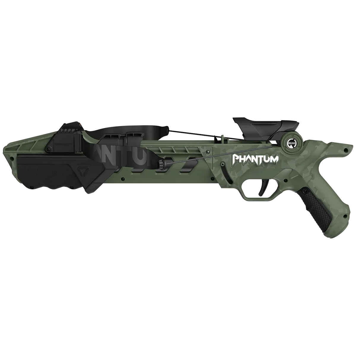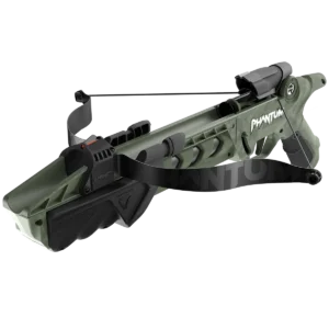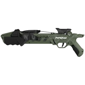 A compact suction-dart crossbow from PHANTUM finished in OD green and black. Designed for recreational target use with suction-cup darts.