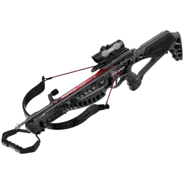 - Ready-to-use kit – precision red dot scope with neoprene scope armour, rope cocking device, 2 x 20" Headhunter arrows and a lightweight side-mount quiver; mostly assembled for quick setup.