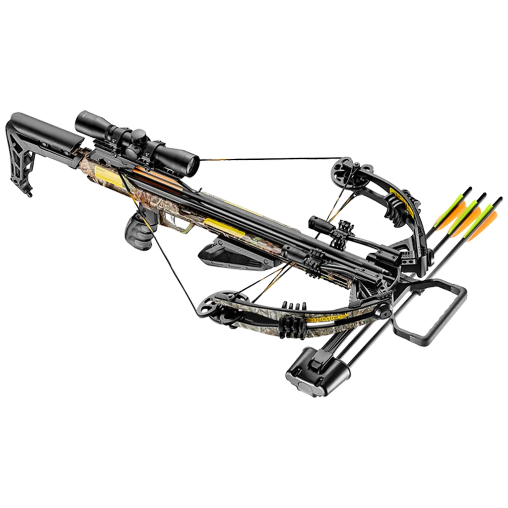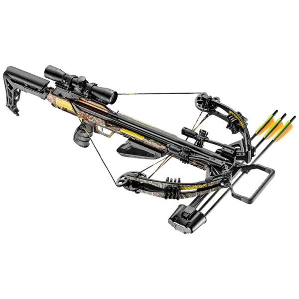 The Accelerator 370+ Compound Crossbow from EK Archery packs plenty of power in a small package. This crossbow produces around 370fps of muzzle energy and delivers high levels of accuracy. As with all EK Archery crossbows the Accelerator is built-to-last and features a reinforced composite stock that keeps the crossbow both light and strong whilst the textured AR style grip increase control over shot placement. The Accelerator's trigger has a pull weight of around 3.5lb with a crisp let off, the bow also features an anti-dry fire mechanism that helps prevent the leading cause of crossbow malfunction. Ass you would expect from a crossbow of this calibre the Accelerator features a Picatinny rail that is suitable for all kinds of optics and comes with a 4×32 crossbow scope to get you shooting, straight out of the box. The durable quad limb system is made from compressed fibreglass to keep the entire crossbow strong and accurate. The extendable stock is made from a reinforced composite. IN THE BOX – 1x Accelerator 370+ crossbow – 3x Carbon 20" bolts – 1x 4×32 scope – 1x 3-bolt quiver – 1x String stopper set – 1x AR grip – 1x Cocking rope (100cm) – 1x Safety glasses – 1x String wax