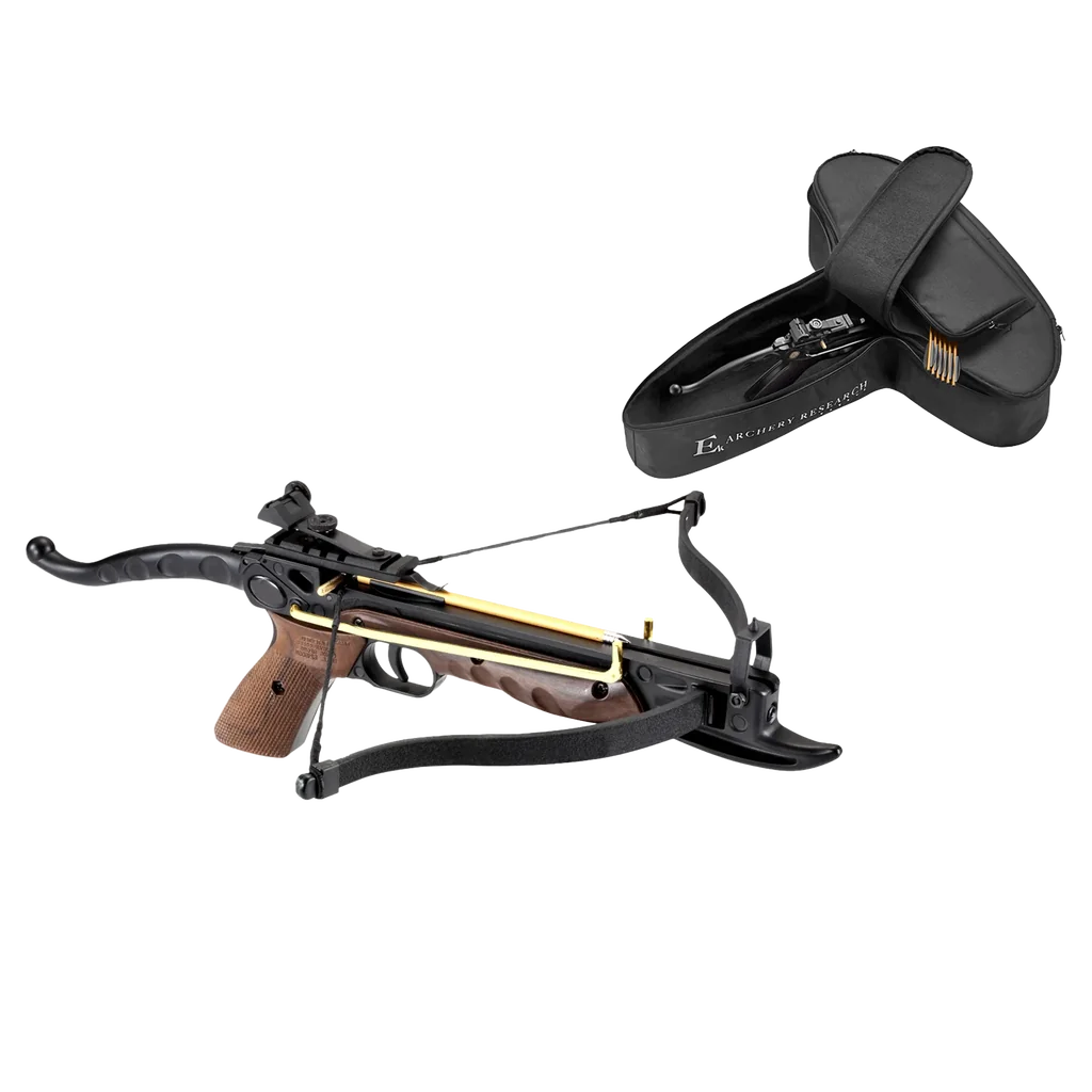 This Pistol Crossbow from EK Archery is made from high quality aluminium and is CNC machined to exact tolerances to be one of the highest powered and accurate pistol crossbows in its price range. The pistol comes with peep sights fitted, but these can be removed to allow the fitting of a red dot sight of crossbow scope. The grip and fore stock are made from a high impact polymer for very hard wearing characteristics as well as improved comfort and aesthetics. The Limbs are constructed from high quality compressed fibreglass which enables a high power output of 80lbs for smooth and precise firing of the bolts. Package includes: – Crossbow with Peep Sight – 3 x 6.5" Aluminium Bolts – Carry Case