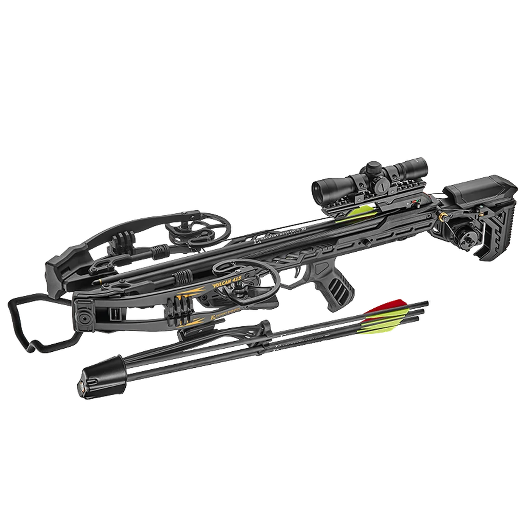 The EK Archery Vulcan 415 is a high-performance reverse-draw compound crossbow built for shooters who demand power, precision, and control. Delivering speed of up to 285 fps, it combines an advanced reverse-draw cam system with balanced ergonomics for consistent accuracy and smooth, stable shooting. Key features include a compact reverse-draw design for improved power stroke and balance, a silent integrated cranking system for effortless cocking, and anti-dry fire safety for added protection. An adjustable ball-bearing arrow retention system reduces friction for repeatable accuracy, while a refined trigger assembly ensures a smooth, precise pull shot after shot.