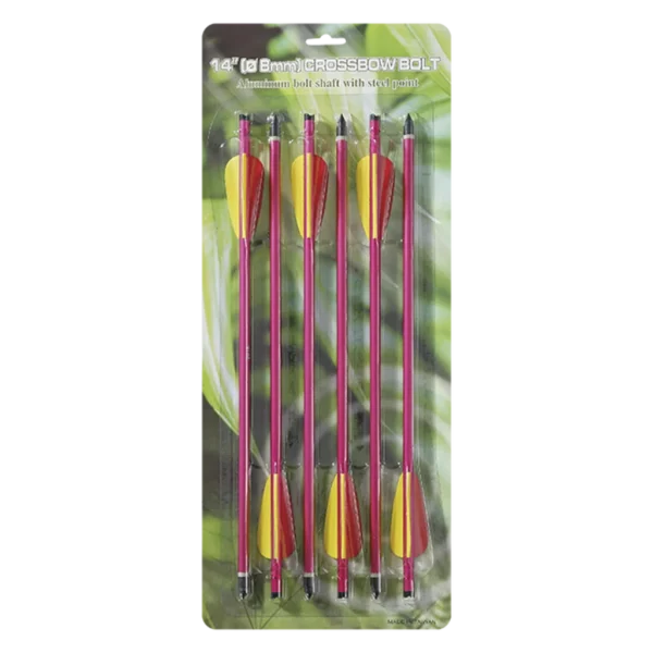 The Man Kung 14 inch aluminium crossbow bolts are suitable for the following crossbows: MK-120/MK-160 & MK-180 models. Length: 14 inch (35.6 cm) Type of point: field point Diameter: 9 mm Weight per bolt: 19 grams Number of vanes per bolt: 3 Shaft material: aluminium Vane material: plastic Point material: steel Shaft color: black Vane color: yellow and red