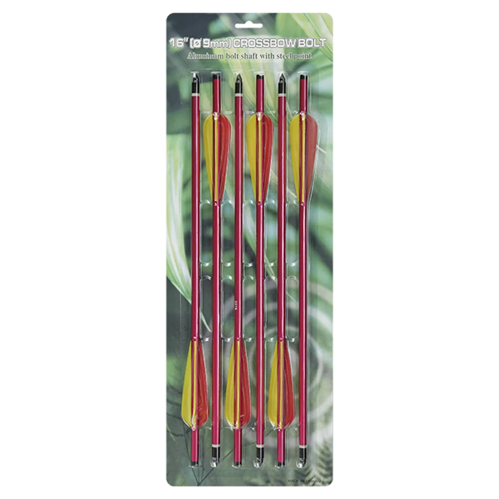 The Man Kung 16 inch aluminium crossbow bolts can withstand more impact than the Man Kung 16 inch carbon crossbow bolt. That bolt, however, is harder which makes it less easy to bend. Features Length: 16 inch (40.6 cm) Type of point: Field point Diameter: 9 mm Weight: 28 grams per bolt Vanes: 3 per bolt Shaft Material: Aluminium (alloy 2219) Vane Material: Plastic Point Material: Steel Shaft Colour: Red Vane Colour: yellow/red