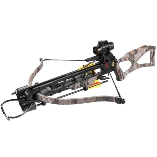 This lightweight model has a draw weight of 175 LBS, which results in a velocity of up to 245 FPS (75 m/s). In the blink of an eye, targets up to 50 meters can be hit accurately. As the quiver is mounted to the side (parallel to the crossbow), it doesn't limit one's manoeuvrability. The red dot sight that comes with this crossbow allows the user to easily scour the environment for their target. Thanks to the 20 mm Picatinny rail, the red dot sight can easily be exchanged for other types of sight. The MK-XB23GODC is a lithe recurve crossbow that’s suitable for experienced and inexperienced users: while it is among the strongest of the Man Kung recurve crossbows, its simple and effective design make it a blast to use. This crossbow is currently available in two colours: this light camo and a black colour (MK-XB23BK). Both come with the following accessories: a red dot, sling, quiver, cocking strong, stringer and 4 Man Kung 16 inch aluminium crossbow bolts.