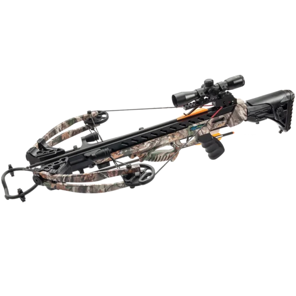 The Man Kung MK-XB56FC Frost Wolf compound crossbow is a wonderful choice for experienced users. The MK-XB56FC has a robust yet light aluminium structure, offering great user comfort for longer shooting sessions. With a draw weight of 175 LBS it manages to blast bolts with an impressive velocity of 375 FPS (114 m/s). Targets up to 90 meters can be hit accurately. The MK-XB56FC has various options for increased user comfort: both the composite stock and the fore grip can be adjusted. Furthermore, it features 20mm Picatinny rails on the top and bottom of the crossbow, allowing the user to attach all sorts of tactical rail accessories. As with any Man Kung crossbow, safety is a top priority. The MK-XB56FC has been provided with several additional safety features, such as an ambidextrous trigger safety, dry fire safety technology (to help prevent shooting without a bolt), and finger guards on the fore grip. This package includes a 4×32 sight (which can be mounted to the 20mm rail located on the upper side of the crossbow), a sling, quiver, cocking string, and 4 Man Kung 20 inch carbon crossbow bolts.