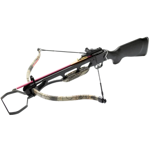 The Man Kung MK-150A1GODC recurve crossbow is identical to the MK-150A1PB, except for its limb and front grip which are featured with a beautiful camouflage print. It is also equipped with an automatic safety and an adjustable sight. This sight can easily be set to your shooting distance. It is mounted on a dovetail rail so you can also mount other sights.