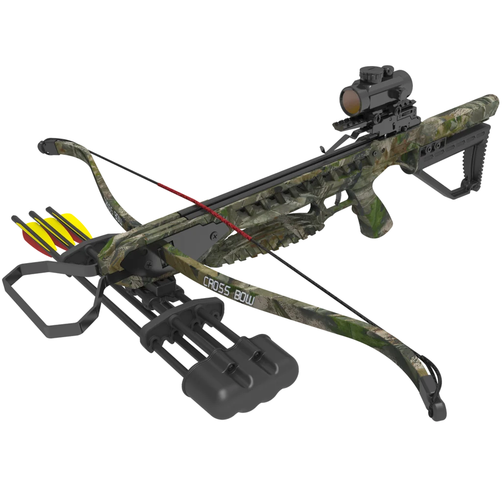 The Man Kung MK-XB21FC Rip Claw recurve crossbow is a powerful model with a draw weight of 175 LBS, which allows it to reach speeds up to 245 FPS (75 m/s). That means it’s easy to hit targets accurately up to 50 meters. Due to its compact design and light weight, the MK-XB21FC is easy to store and take along. Thanks to the adjustable composite stock and the ergonomic design of the aluminium barrel, the compact nature of the MK-XB21FC doesn’t limit user comfort. With the 20mm Picatinny rail on top of the crossbow, the crossbow can easily be adjusted to personal preferences. The MK-XB21FC features an automatic safety system to help avoid damage and is supplied with a red dot, sling, quiver, cocking string, stringer and 4 Man Kung 16 inch aluminium crossbow bolts.