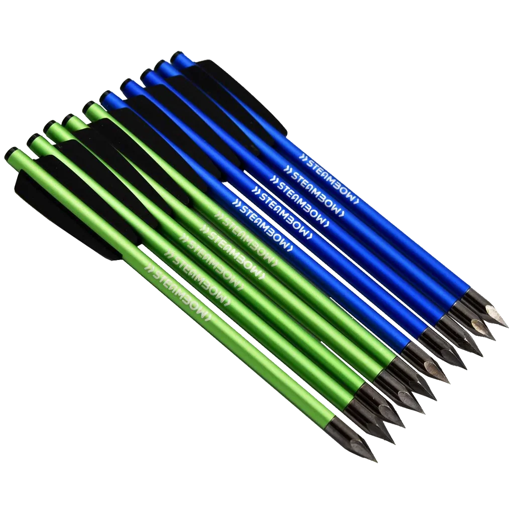 With a weight of 10.5 g / 162 grains per arrow and a hardened hollow ground steel tip these arrows are extremely effective. The colorful design with the Steambow engraving perfectly round these arrows off. While they lack blades, Bodkin Arrows are sharp and require extra caution during use – Due to their sharpness and ability to cut through targets, these arrows wear down target surfaces faster, so they are not recommended for regular practice. No matter what draw weight you use, and at very short distances, you must be sure to use a suitable target medium.