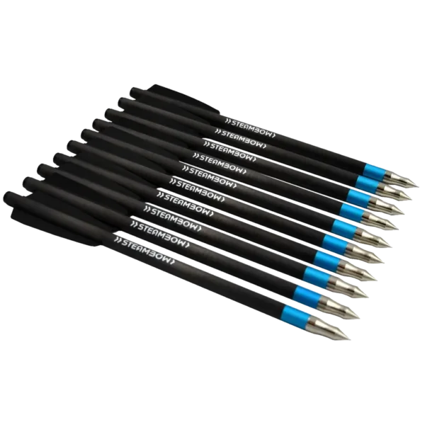 Steambows Target Arrows are optimized for maximum precision and meet all the needs of an ambitious target shooter. Highly precise flight characteristics, a weight matched to the crossbow limbs, a very robust design, and a point that does as little damage to the target as possible.The good characteristics of these carbon arrows shine especially at longer distances. Ambitious target shooters demand repeatable results and as little wear on their materials as possible. The focus is on regular practice, and the goal is the greatest possible precision and accuracy in competitions. The light Target Arrows are optimized for draw weights from 35 to 75 lb and, thanks to their low weight, offer a flat trajectory and high velocity. They have a carbon shaft, a glued point, and a high-quality polymer nock.