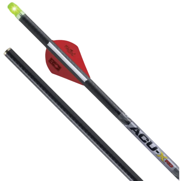 Configured specifically for TenPoint rail-less reverse-draw crossbows, the 20" ACU-X RD premium carbon arrows deliver consistent, visible flight and reliable nock engagement during practice and at the range. Each 20" arrow is balanced at 16.5% F.O.C. with a 92-grain brass insert and a factory weight of 440 grains (with included 100-grain field point), producing stabilized trajectories and improved downrange accuracy. The ACU-X Snap-On Lighted Nock activates on firing for superior flight visibility – the LED runs approximately 24 hours when activated and can be deactivated by pulling the nock straight out with your fingers or a Bednar Perfect Puller(R) (sold separately). The nock's audible "click" on engagement helps eliminate lateral travel and protects string center serving life. The shaft uses a precision spine-indexing manufacturing technique tailored to the reverse-draw platform for repeatable spine orientation and shot-to-shot consistency. Two-inch Blazer(R) vanes provide stable fletching behavior at extended ranges, while each arrow is inspected to .001" straightness and matched within 1 grain per arrow for consistent ballistics. Packaged as a 3-pack, these arrows include an ACU-X Snap-On Lighted Nock (29-grain nock weight) and are sized to .297" ID / .344" OD – intended only for use with TenPoint rail-less reverse-draw crossbows. Ideal for target shooters and recreational archers using TenPoint reverse-draw crossbows.