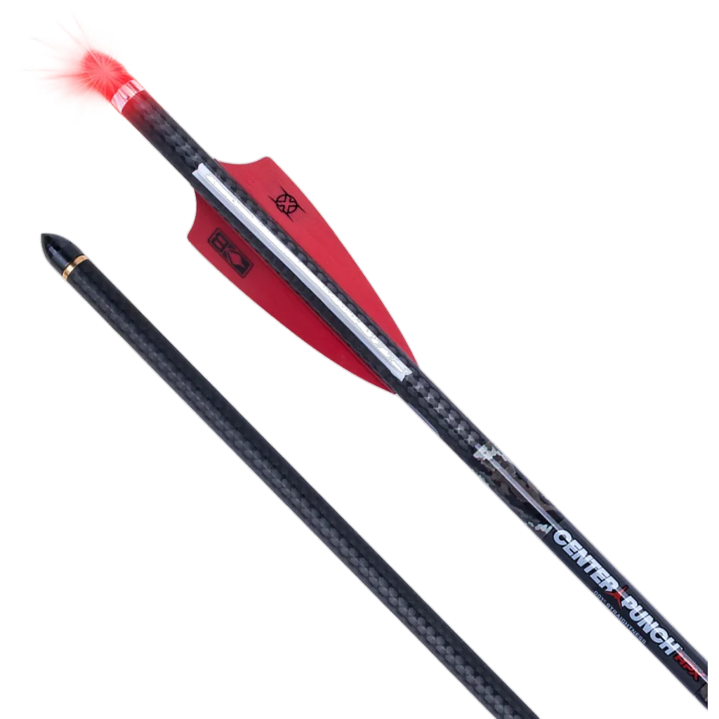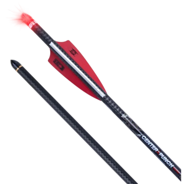 The Lighted CenterPunch HPX Premium Carbon Arrows give target shooters and archers improved visibility and consistent performance. Each 20-inch arrow is built to exacting standards-445 grains (+/-1) with straightness to .001" and weight-grain matched per pack-to deliver repeatable shot-to-shot accuracy. The Alpha-Blaze Lighted HPX nock activates when the bowstring seats the nock into the bushing, providing a bright LED that lasts approximately 24 hours for easier arrow recovery during practice; the light is easily deactivated by pulling the nock straight out (Bednar Perfect Puller(R) sold separately). Durability and downrange performance are addressed through a unidirectional carbon inner layer for stiffness and a woven carbon fibre outer layer for impact strength, plus an 87-grain brass insert and 3" Bohning X vanes. The patented Alpha-Nock HPX with HP aluminium bushing, deep string groove and elongated ears ensures straight nock travel, minimises serving wear and helps maintain consistent flight characteristics. These arrows are optimised for crossbow use at the range and are compatible with all railed TenPoint and Wicked Ridge crossbows, supplied here as a 3-pack.