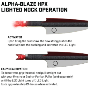 - Alpha-Blaze Lighted HPX nock with easy string-activated LED – provides superior flight visibility for quicker arrow recovery at the range; LED runs approximately 24 hours when activated and can be deactivated by pulling the nock straight out (Bednar Perfect Puller(R) sold separately).