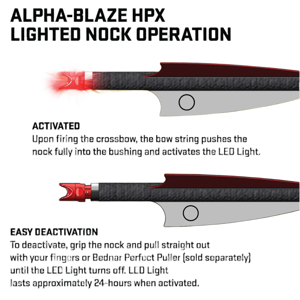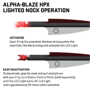 - Alpha-Blaze Lighted HPX nock with approximately 24-hour LED – activates on firing for superior flight visibility and easily deactivates by pulling straight out (Bednar Perfect Puller compatible).