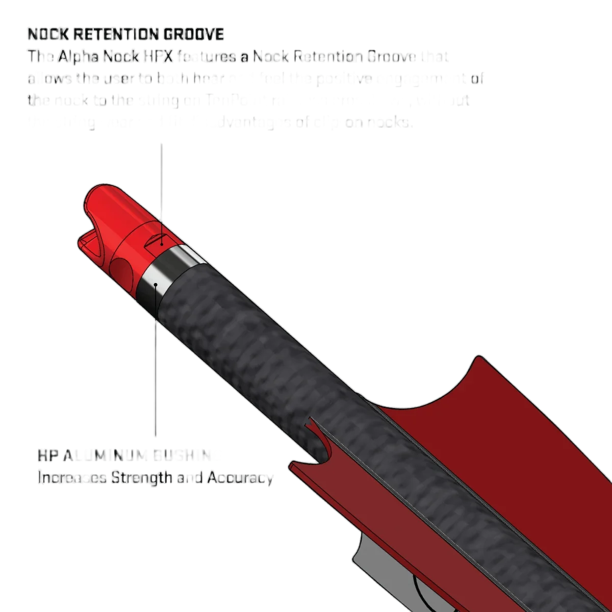 - Durable construction with a unidirectional carbon inner layer for stiffness and a woven carbon outer layer for impact strength; Alpha-Nock HPX includes an HP aluminum bushing, deep bowstring groove and elongated ears for straight nock travel and reduced serving wear.