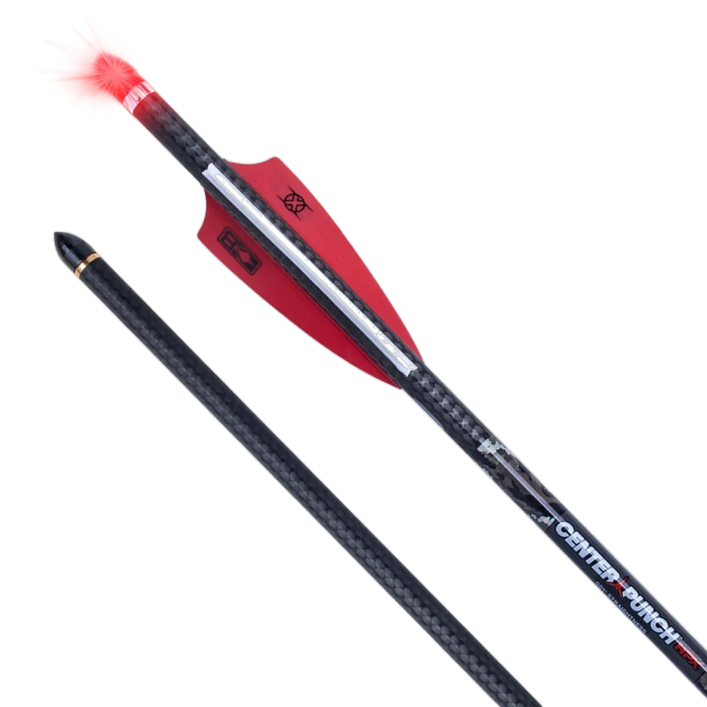 The Lighted CenterPunch HPX Premium Carbon Arrows combine visible flight tracking with precision construction to give target shooters reliable, repeatable performance. The Alpha-Blaze Lighted HPX nock activates on shot – when the bowstring fully seats the nock into the bushing – providing approximately 24 hours of LED illumination for superior flight visibility and easier arrow recovery. When you need to turn the light off, simply pull the nock straight out by hand or with a Bednar Perfect Puller (sold separately). At 20 inches and 445-grains (+/- 1), these arrows are inspected to .001 inches straightness and weight-grain matched within 1-grain to promote consistent downrange accuracy and tight groupings. A 15.5% F.O.C. and an 87-grain brass insert improve stability and target impact consistency, while the unidirectional carbon inner layer and woven carbon outer layer balance stiffness and impact resistance. The Alpha-Nock HPX design – including an HP aluminum bushing, deep bowstring groove, large radius base and elongated ears – ensures straight nock travel, minimizes serving wear and pairs seamlessly with all railed TenPoint and Wicked Ridge crossbows. Each 3-pack ships with 3-inch Bohning X vanes and delivers the durability and consistency archers and enthusiasts rely on at the range or during practice.