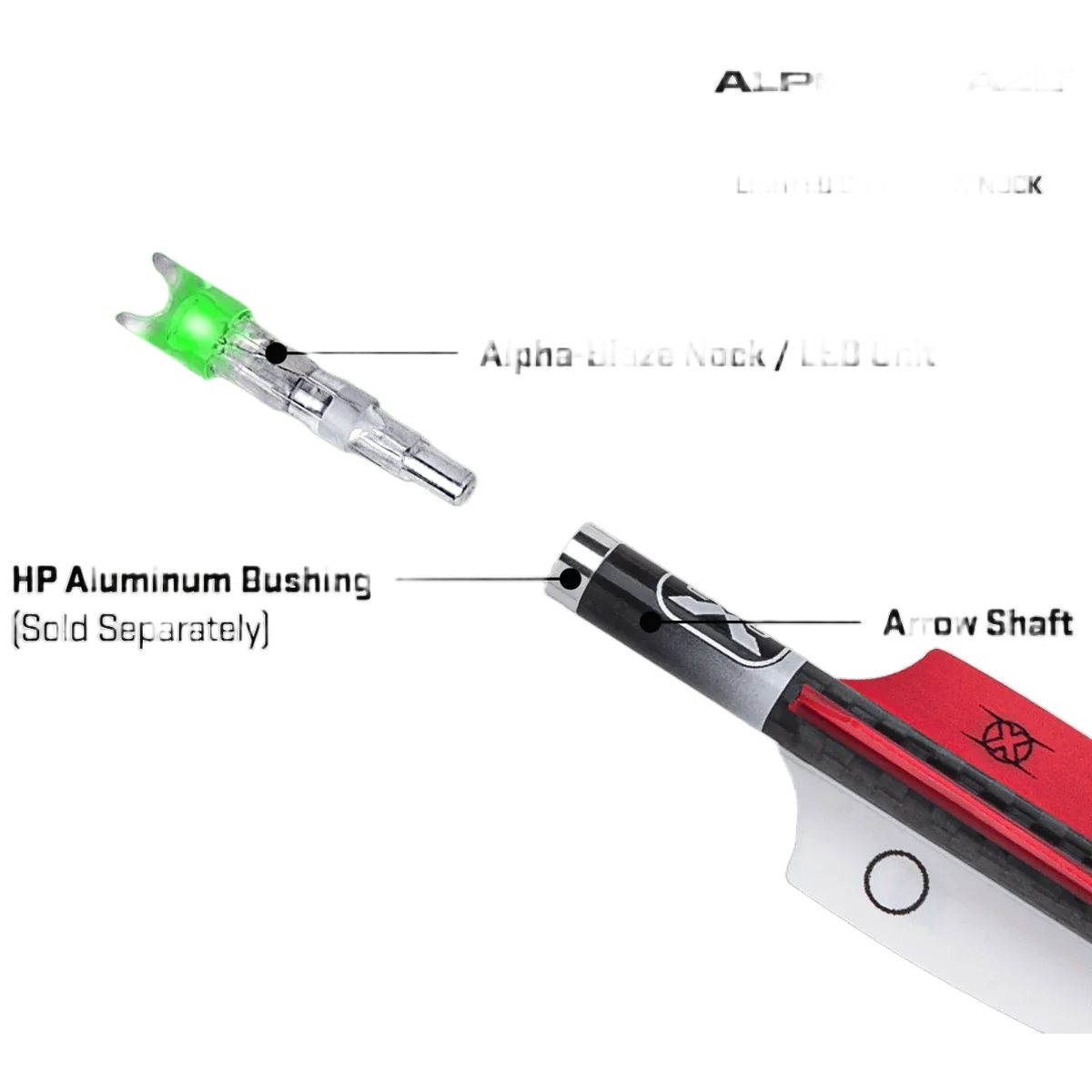 - Precision nock and bushing system: Alpha-Nock HP with deep bowstring groove and HP aluminium bushing yields straight nock travel, minimises string serving wear, and maintains the same point of impact as unlighted arrows.