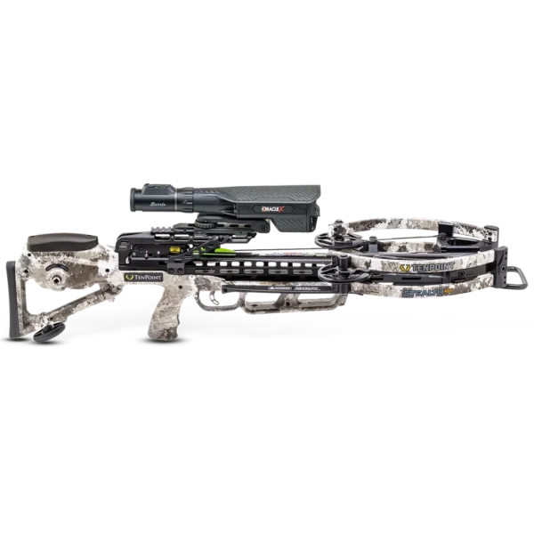 The Stealth 450 Oracle X pairs high-speed performance with practical range advantages to help you achieve consistent, precise long-range shots. Delivering up to 450 fps from a 13" power stroke, the platform provides the kinetic performance needed for extended-range target shooting while remaining compact — 6.5" wide uncocked, 33" long and 7.5 lb — so you can manoeuvre in tight shooting positions or on elevated platforms. Precision features focus on consistent accuracy and safe operation during practice. The Burris Oracle X 2x-7x rangefinding scope displays distance and computes an exact aiming point that accounts for shot angle to eliminate multiple aim points. The S1 two-stage, zero-creep trigger with roller sear yields a predictable 3.5 lb pull, while scope struts and an extended dovetail provide a rock-solid mounting platform for heavier optics. Patented ACUslide cocking/de-cocking offers quiet cocking and controlled, safe de-cocking; integrated string stops reduce noise and vibration and the Sentry bowhanger protects arrow points when staging, combining to make the Stealth 450 a durable, accurate choice for serious target shooters and archery enthusiasts.