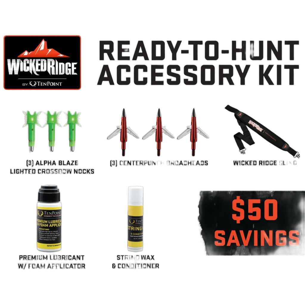 - Complete Ready-to-Shoot kit that bundles the essential accessories: 3-pack Alpha-Blaze Lighted Crossbow Nocks ($44.99), 3-pack CenterPunch Broadheads ($44.99), Wicked Ridge Sling ($34.99), Premium Lubricant with Foam Applicator ($15.99), and String Wax and Conditioner ($12.99).