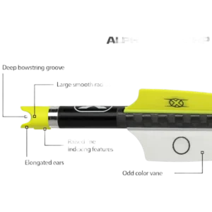 • Patented Alpha-Nock HP-deep bowstring groove, large smooth radius base, and elongated ears-provides straight nock travel, improved downrange accuracy, and reduced serving wear